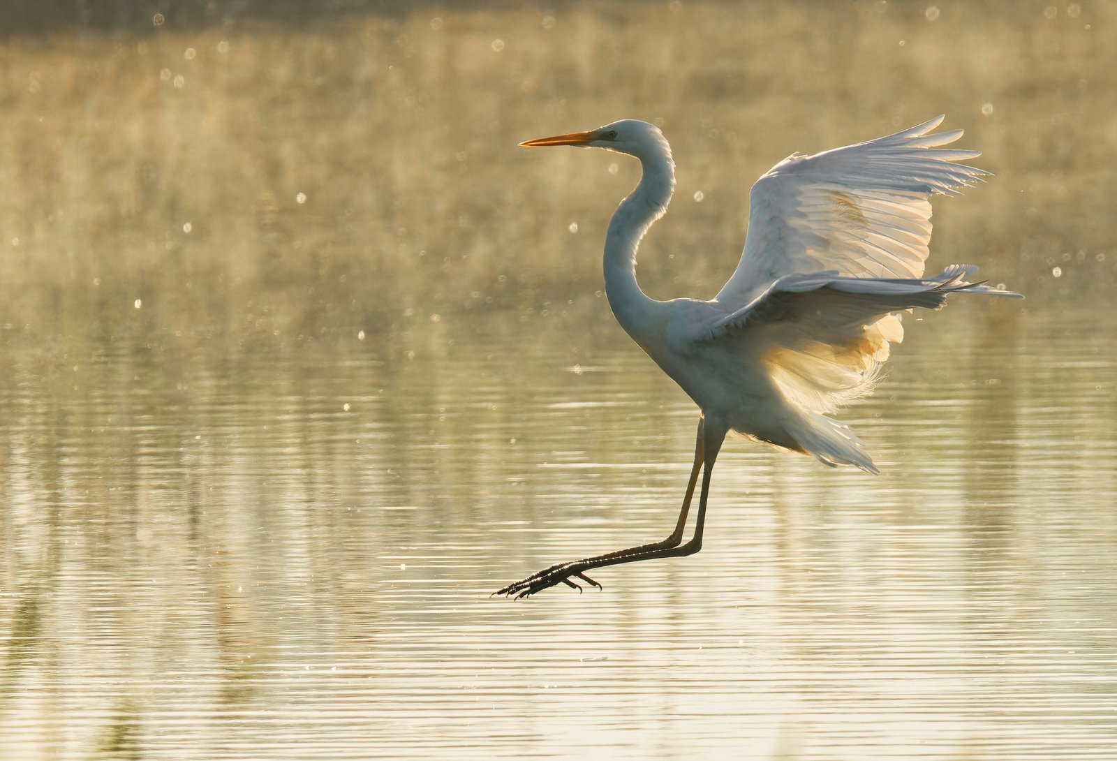 Een sierlijke Zilverreiger zweeft door het zachte goud van de opkomende zon – een krachtig moment vol rust, vrijheid en elegantie. Deze natuurfoto brengt niet alleen pure schoonheid, maar ook een gevoel van ontspanning en verbondenheid met de natuur.